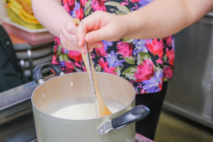 その後豆乳を混ぜながら、じっくりと温度を上げていきます。80度に達したら「にがり」を加え、すると豆腐がゆっくりと固まり始めます。この待つ時間が、手作り体験の醍醐味となるのです。