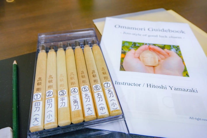 作業時間はおよそ2時間。香りの良い楠の木を左手に、右手に彫刻刀を持ち、じっくりと自分だけの旅のお守り作りに思いを馳せていきます。