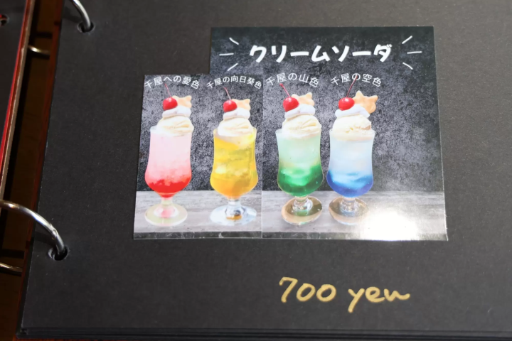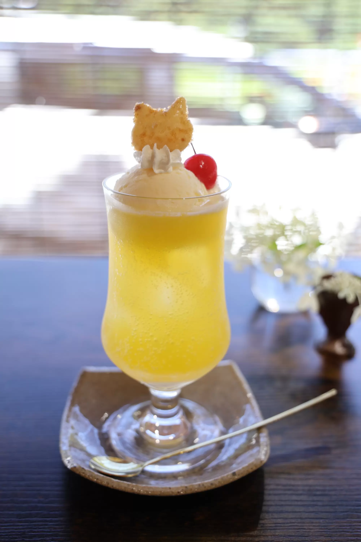 他には、赤いソーダの「千屋への愛色」、グリーンソーダの「千屋の山色」、ブルーソーダの「千屋の空色」があり、ネーミングからオーナーの千屋への愛が感じられました。アイスクリーム、生クリームの上には、もちろん猫のデコレーションがあります。