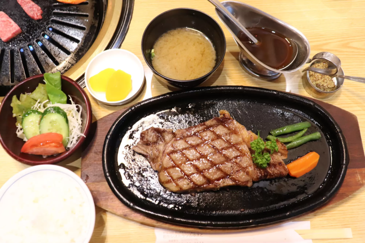 岡山県を代表する高級ブランド和牛「千屋牛」。ステーキはヒレ、ロース、サーロインの中から、グラム数も選ぶことができます。今回はロースの200グラムを注文しました。何といっても柔らかく、脂(あぶら:肉の油分)の入り具合が絶妙です。脂がすっと溶けて上品な味わいで、ここに来た価値がありました。タレも美味しいですが、岩塩(いわしお:天然の塩)で食べると甘みがよく分かります。