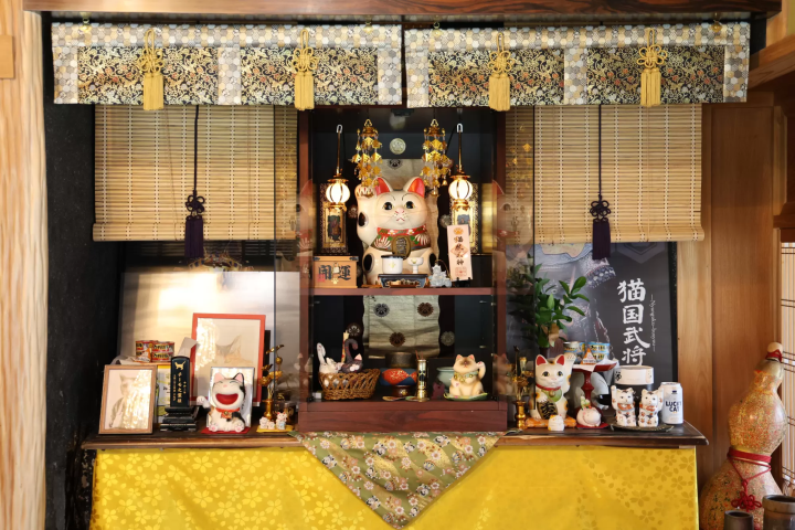 敷地内やカフェを2匹の猫、ネネちゃんとバロンくんが自由に過ごしています。おとなしくて賢い猫で、お店の看板猫になっています。広いカフェの中には、猫の祭壇(さいだん:飾り台)があります。