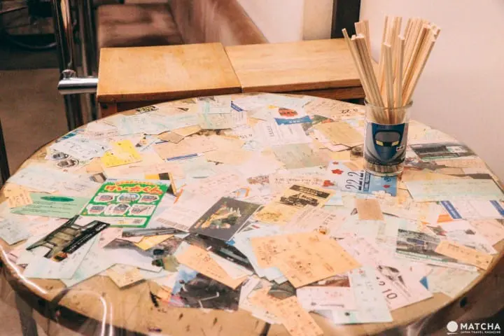 座席の横には、立ち飲み用のテーブルが置かれています。テーブルの上には、店長と常連客が旅の記念に残しておいた切符がずらり。常連客は、これらの切符を眺めながら、旅の思い出話に花を咲かせるそうです。