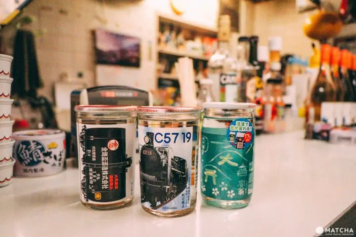日本酒も約5種類を常備。電車が描かれたオリジナルのカップ酒は、新潟県の蔵元「金鵄盃酒造(きんしはいしゅぞう)」が「キハ」のためだけに特別に製造しているもので、この酒蔵と「キハ」でしか手に入らない貴重な品です。