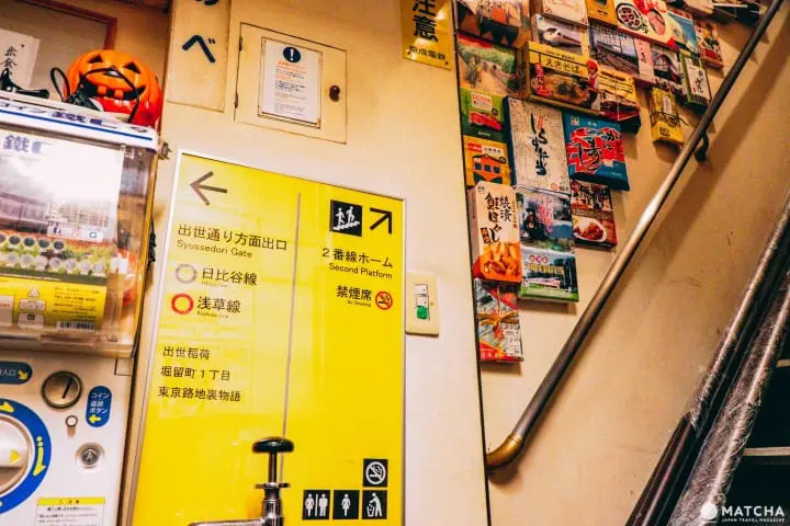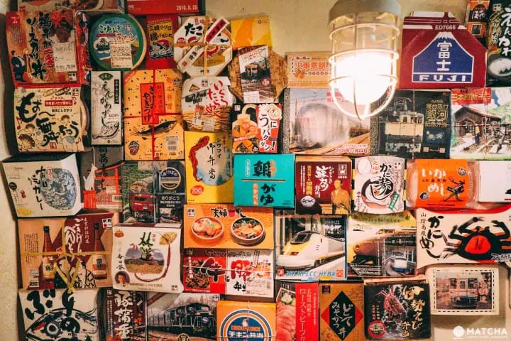 店内は1階が「1号車」、2階が「2号車」と呼ばれています。1号車から2号車へと続く階段の壁には、日本全国の駅弁の掛け紙が100種類近くも飾られています。
